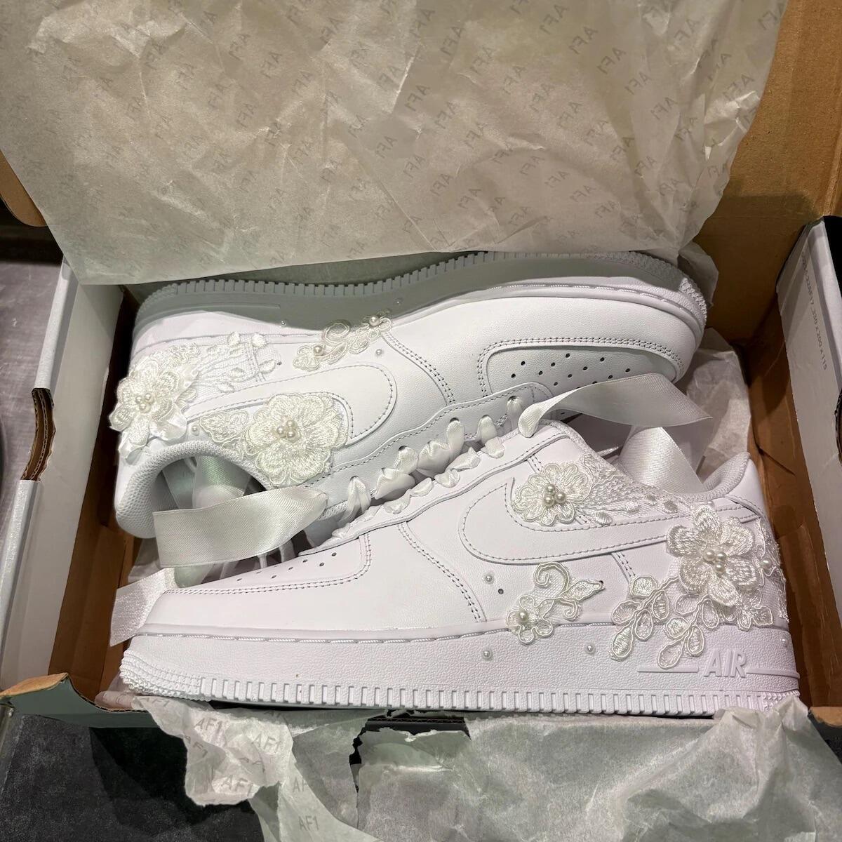 Celebrate in style with our Nike Air Force 1 ’07-inspired wedding sneakers, beautifully decorated with pearls and floral lace. Personalize them with initials and your wedding date, creating a unique, elegant touch for your special day.