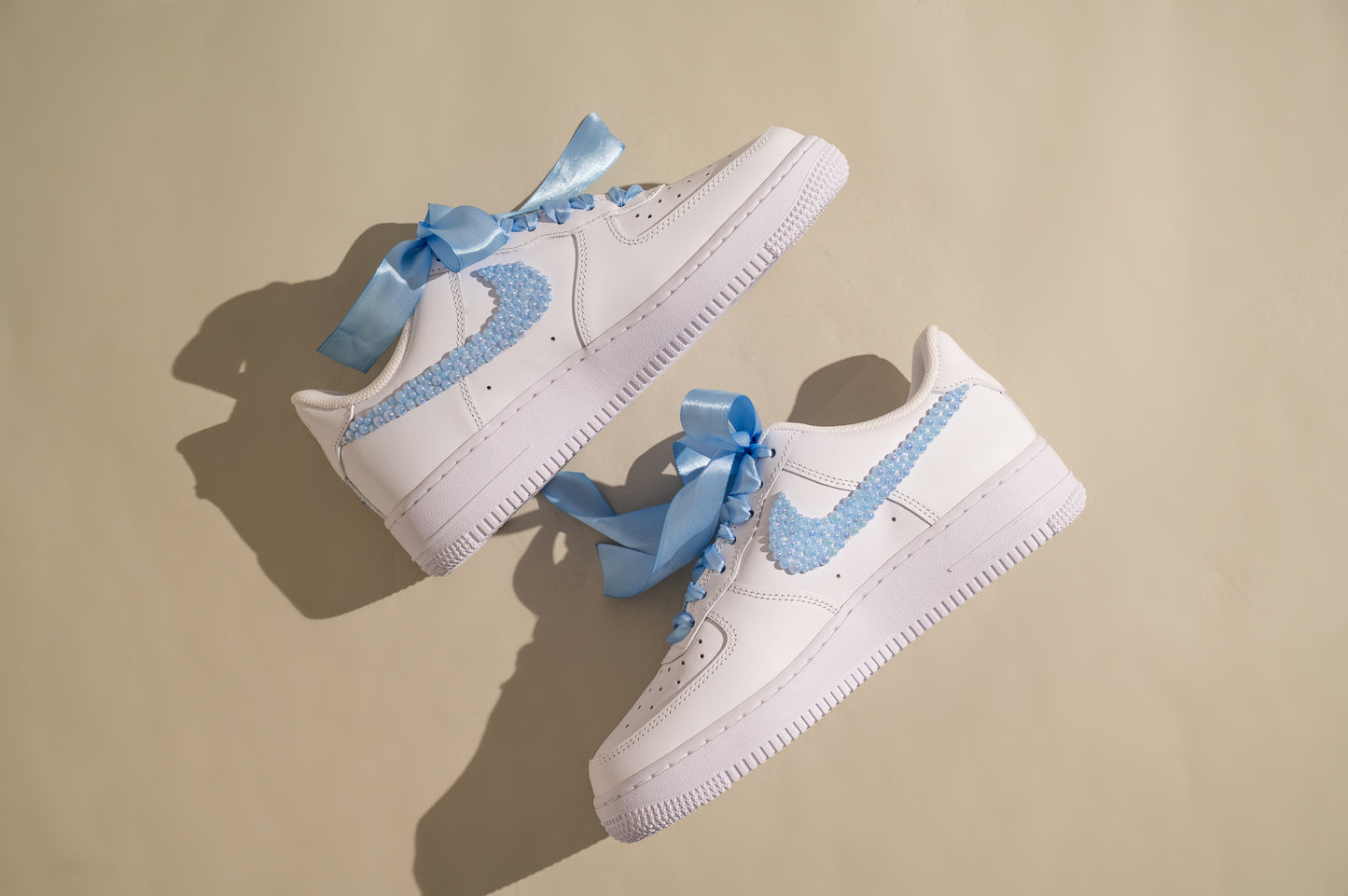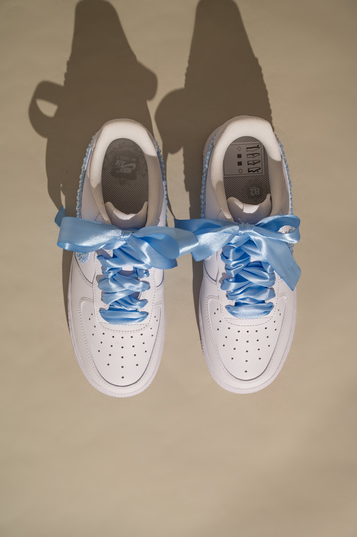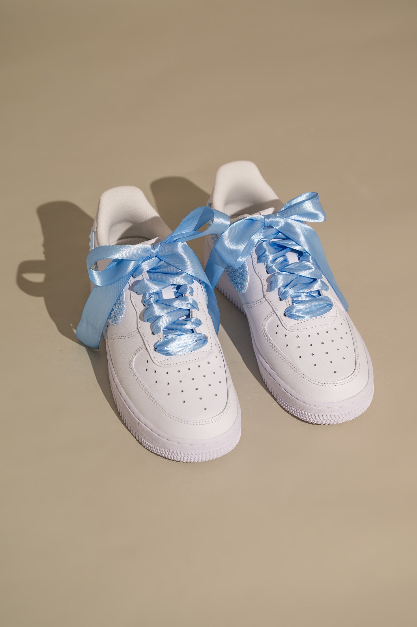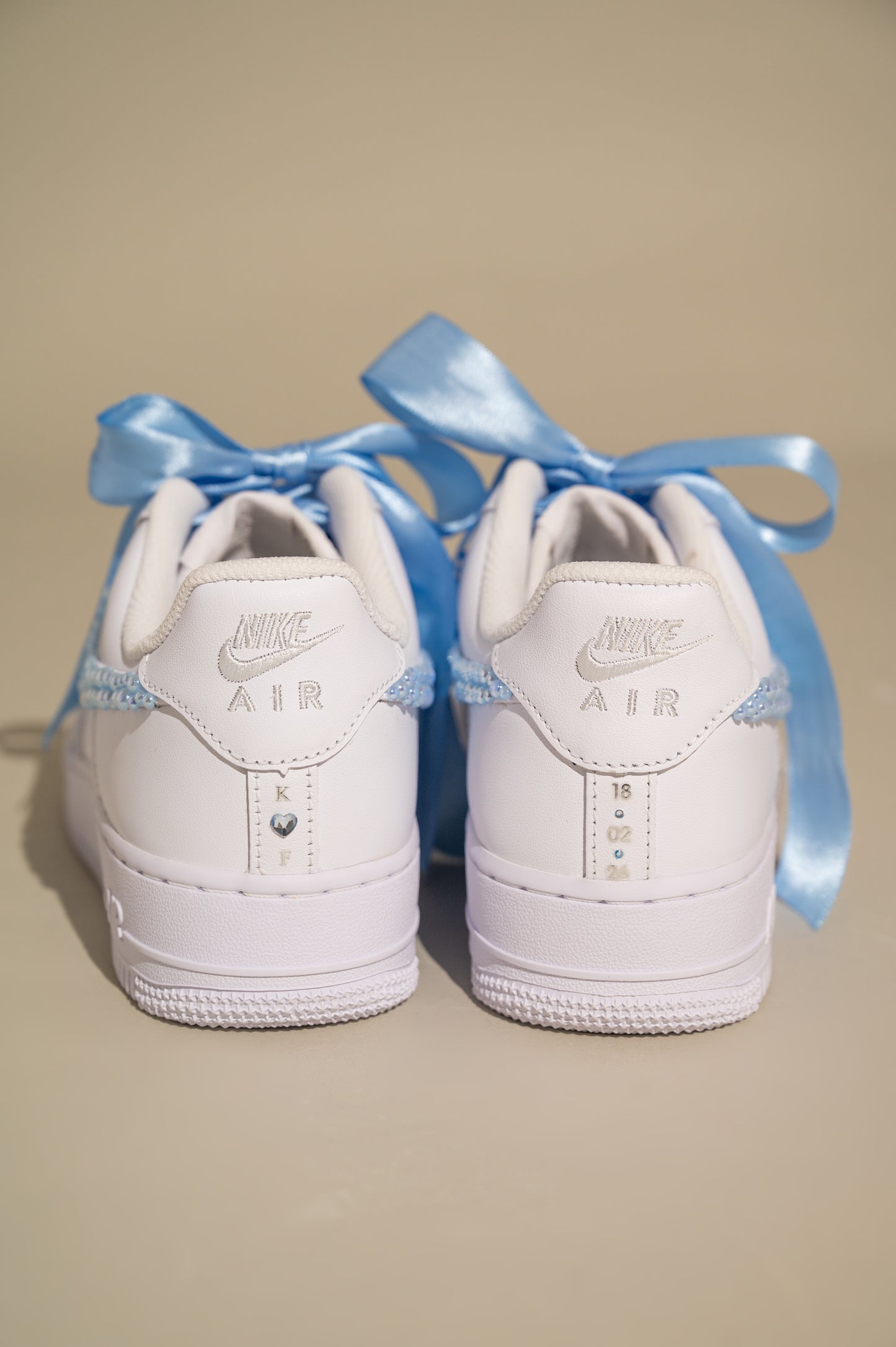 Step into your wedding day with comfort and personality in our White Bridal Sneakers with Blue Lace and Pearls, inspired by the iconic Air Force 1 silhouette. Designed for brides who want to enjoy every moment — from walking down the aisle to dancing through the night — these custom sneakers blend elegance, comfort, and playful bridal charm.