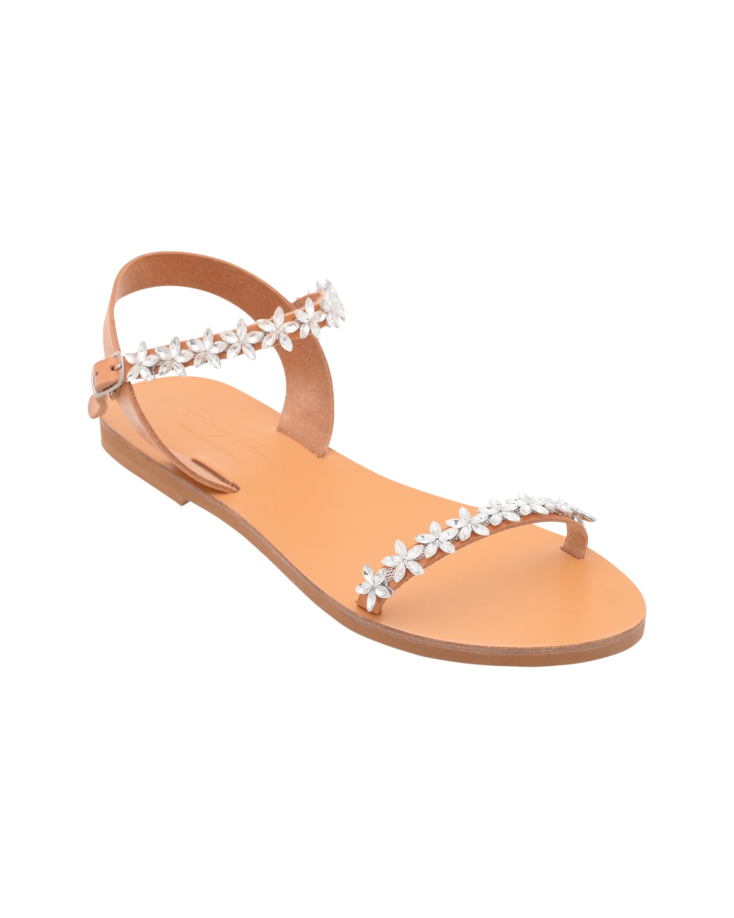 These bridal flat sandals are decorated with a chain full of flower rhinestones with silver undertones color. All the embellishments are hand sewn onto the leather straps. The soles are rubber with heel height 1.5 cm (0.59 inches) which offers stability and comfort for a bride.
