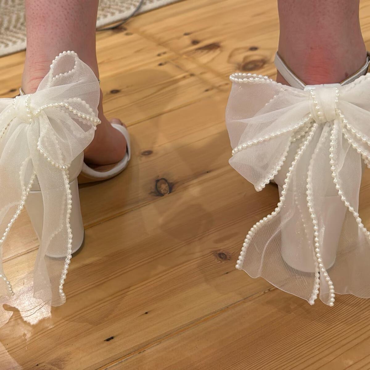 White Leather Block Heel Sandals with ORGANZA BACK BOW, Rise above the Waves