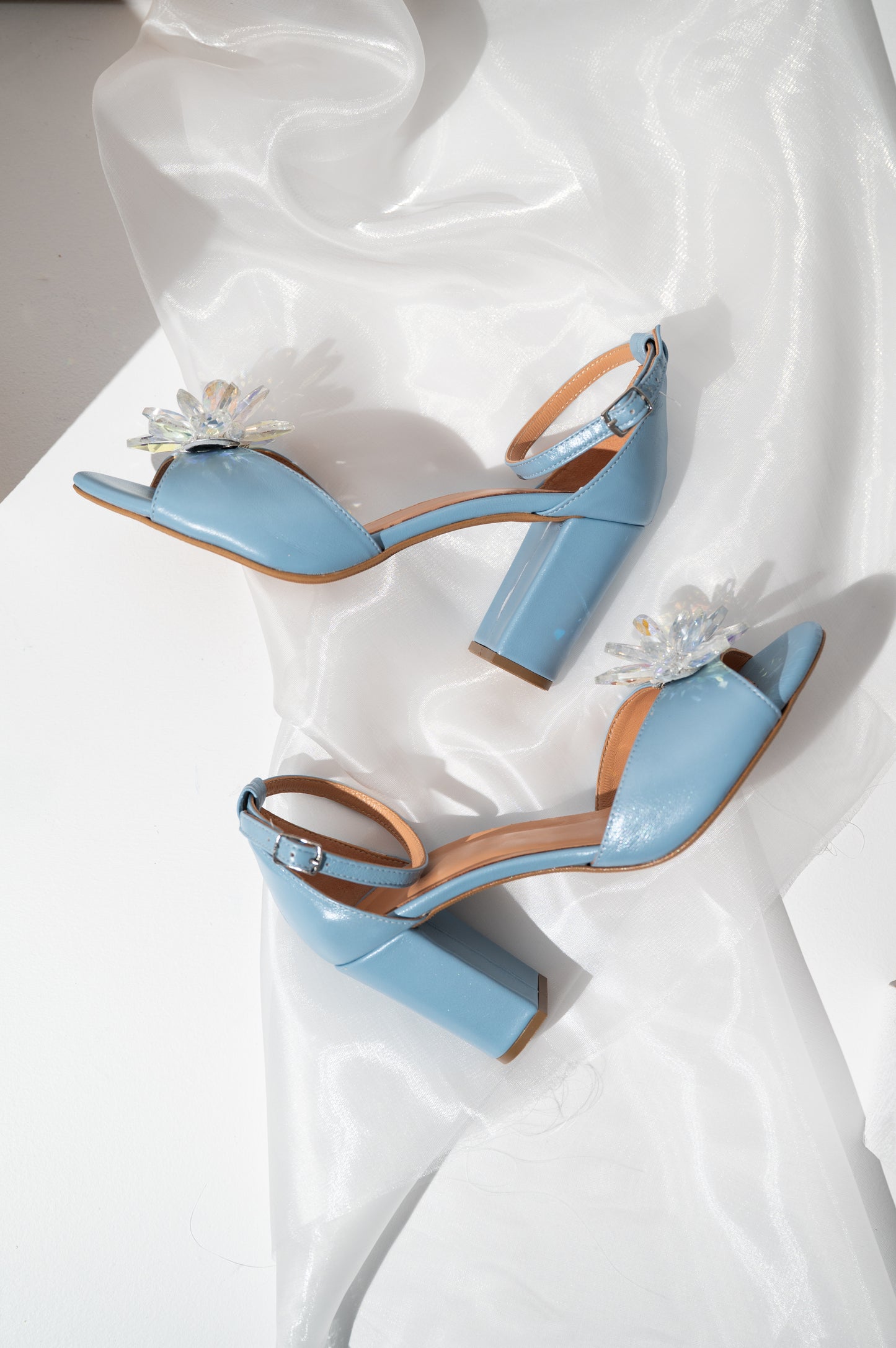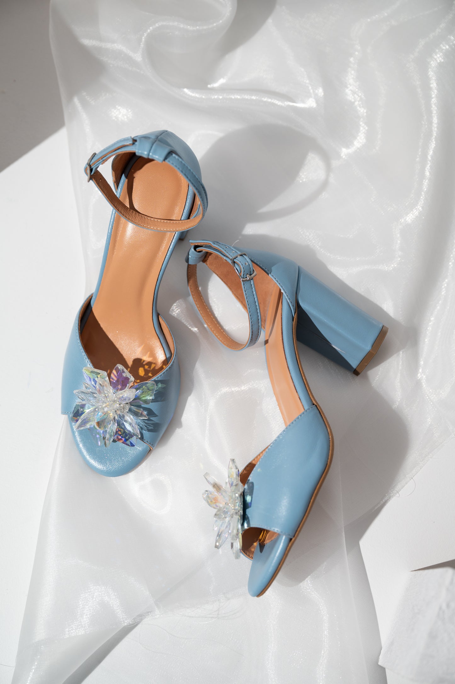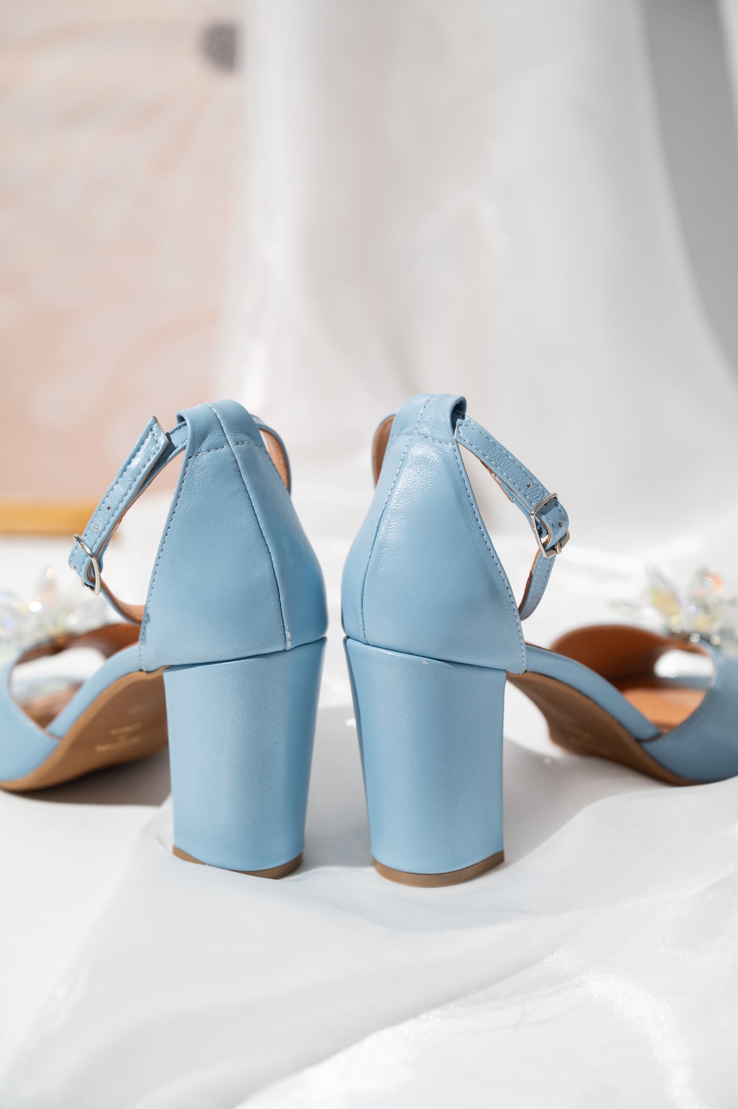 Αυτά τα μπλε νυφικά πέδιλα με χοντρό τακούνι αποτελούν μια υπέροχη επιλογή για νύφες που θέλουν να ενσωματώσουν το “something blue” στο νυφικό τους look. Είναι κατασκευασμένα από γνήσιο δέρμα και διαθέτουν κομψό σχέδιο με ανοιχτή φτέρνα, ενώ στο μπροστινό μέρος διακοσμούνται με λαμπερές κρυστάλλινες χάντρες που προσθέτουν διακριτική λάμψη και κομψότητα.