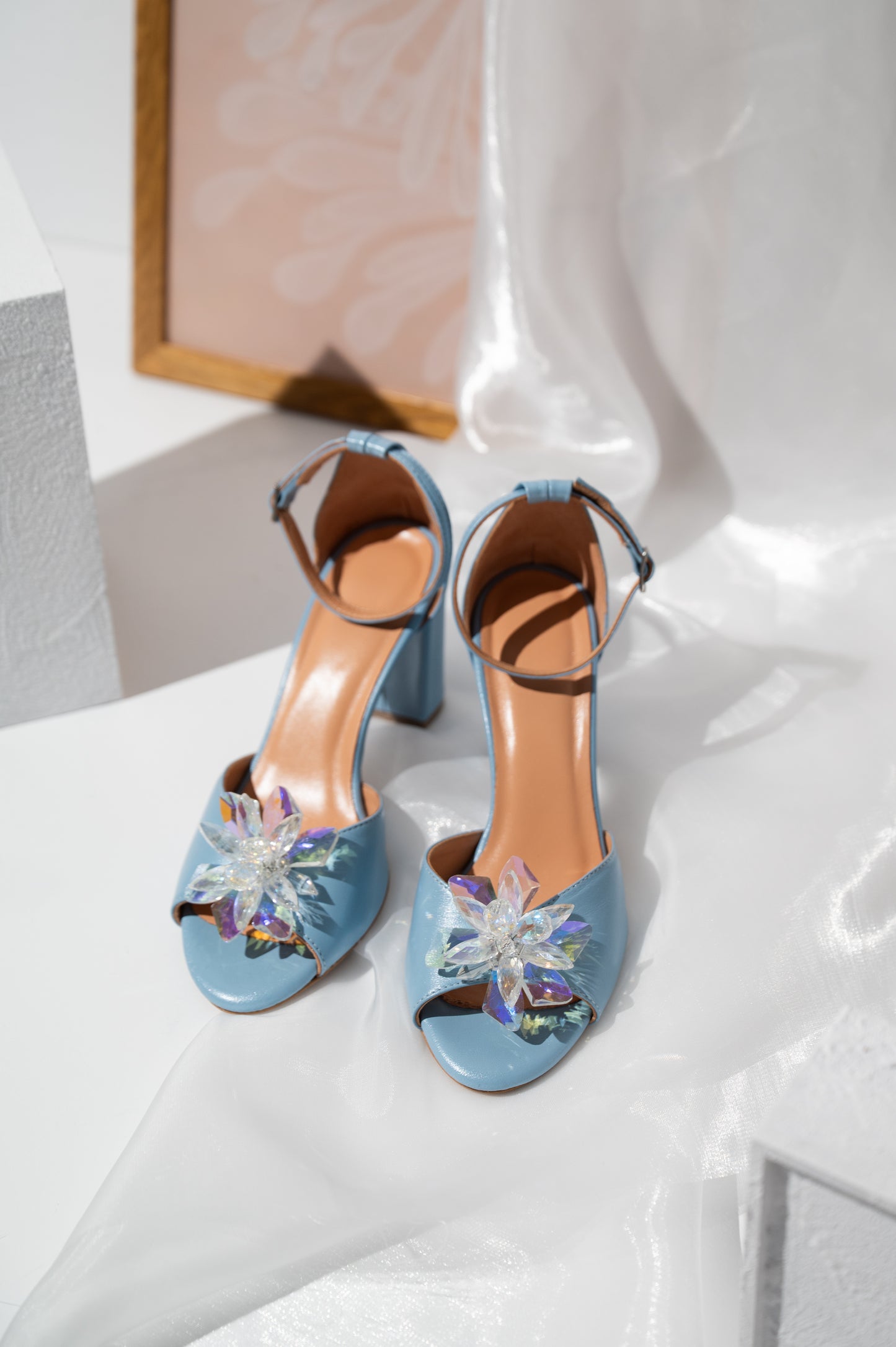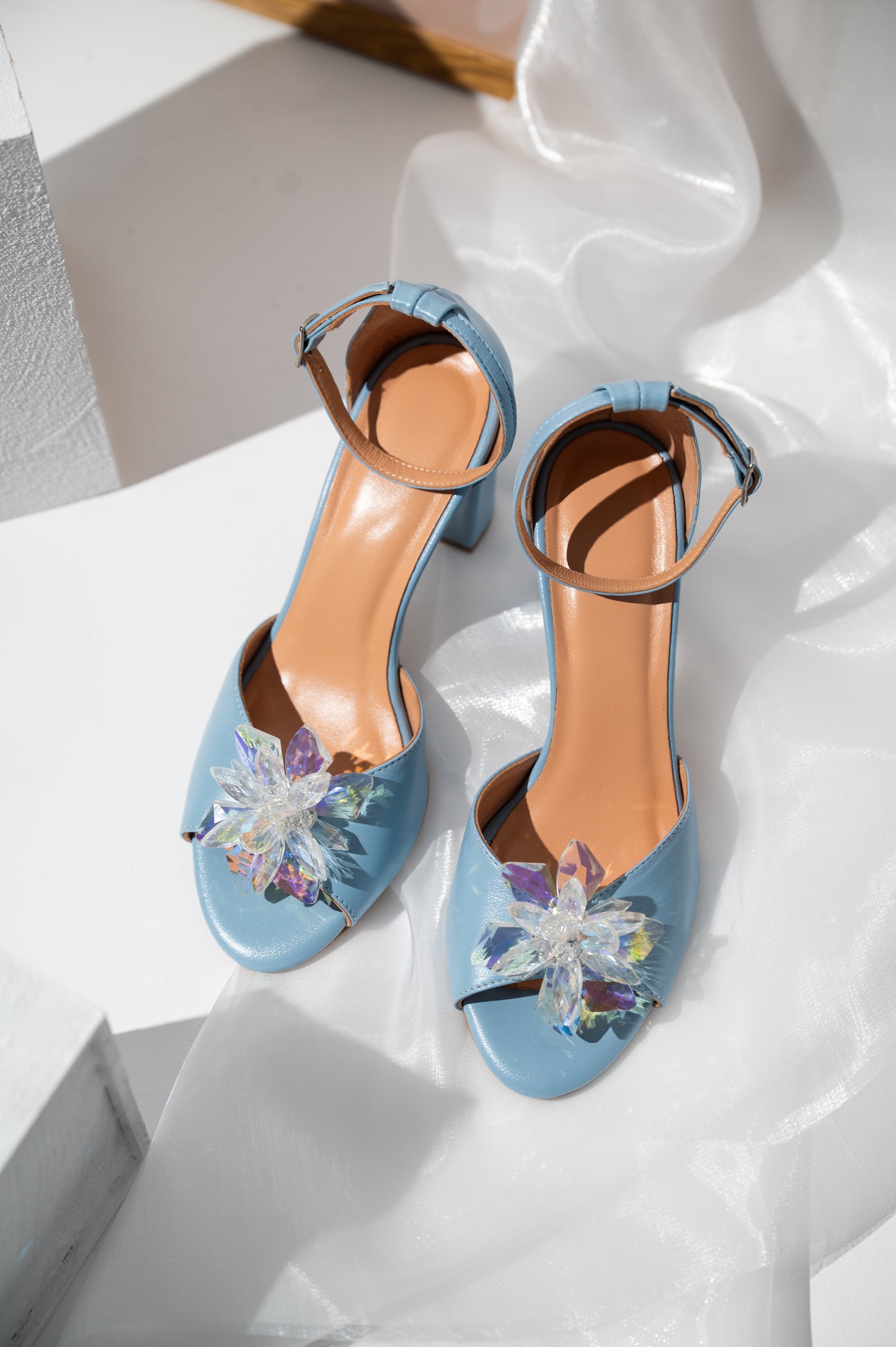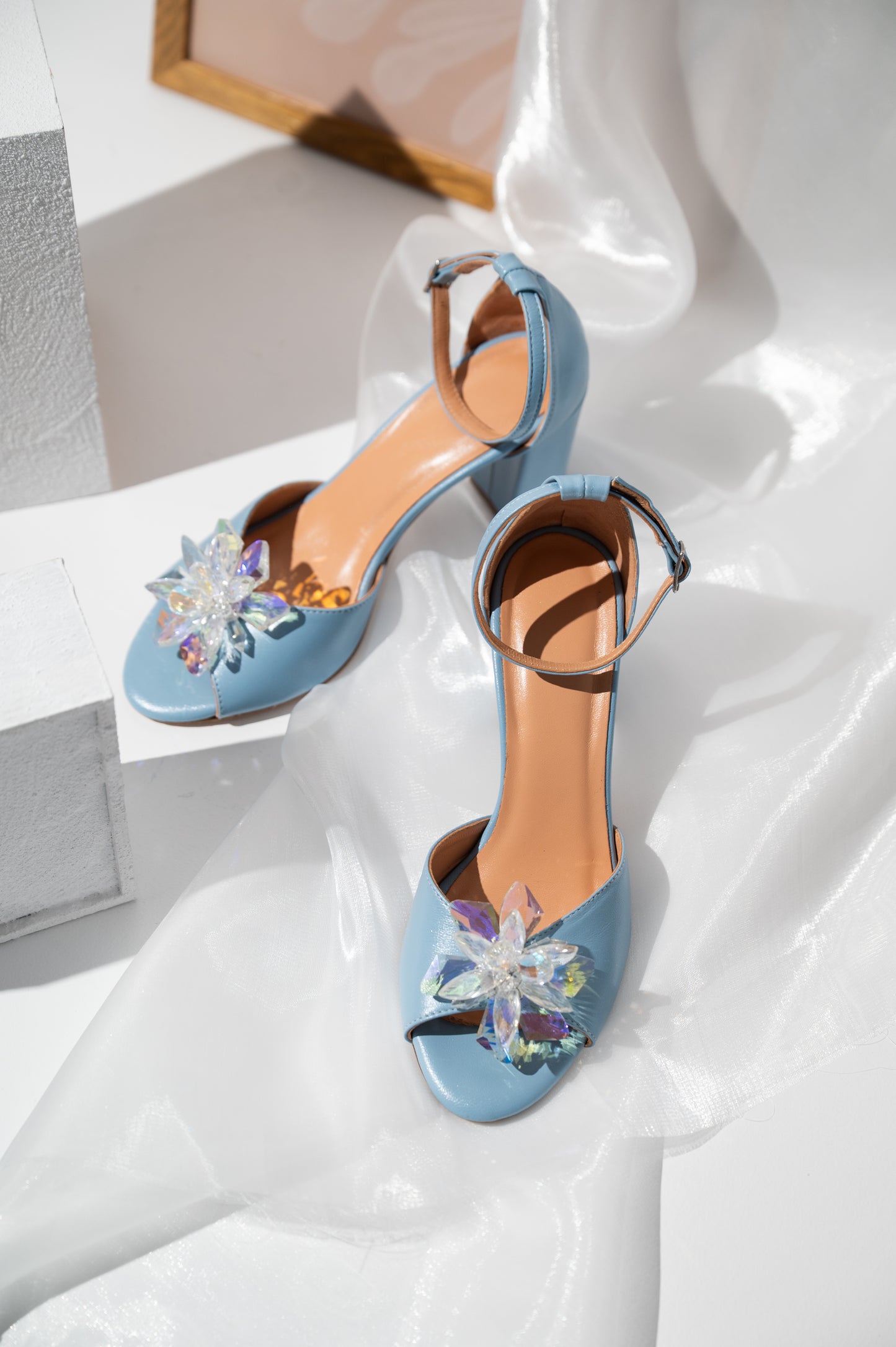 Αυτά τα μπλε νυφικά πέδιλα με χοντρό τακούνι αποτελούν μια υπέροχη επιλογή για νύφες που θέλουν να ενσωματώσουν το “something blue” στο νυφικό τους look. Είναι κατασκευασμένα από γνήσιο δέρμα και διαθέτουν κομψό σχέδιο με ανοιχτή φτέρνα, ενώ στο μπροστινό μέρος διακοσμούνται με λαμπερές κρυστάλλινες χάντρες που προσθέτουν διακριτική λάμψη και κομψότητα.