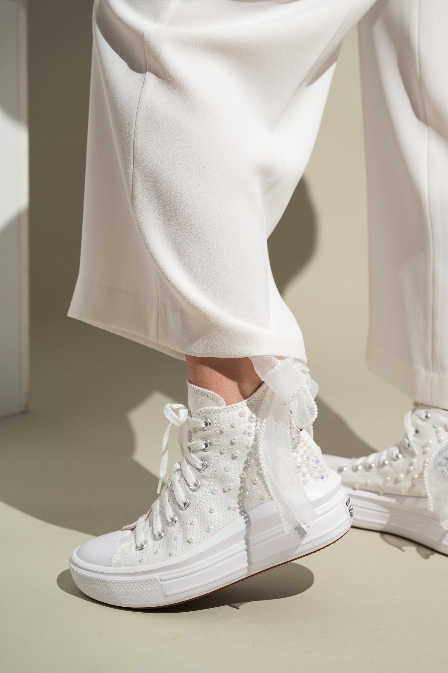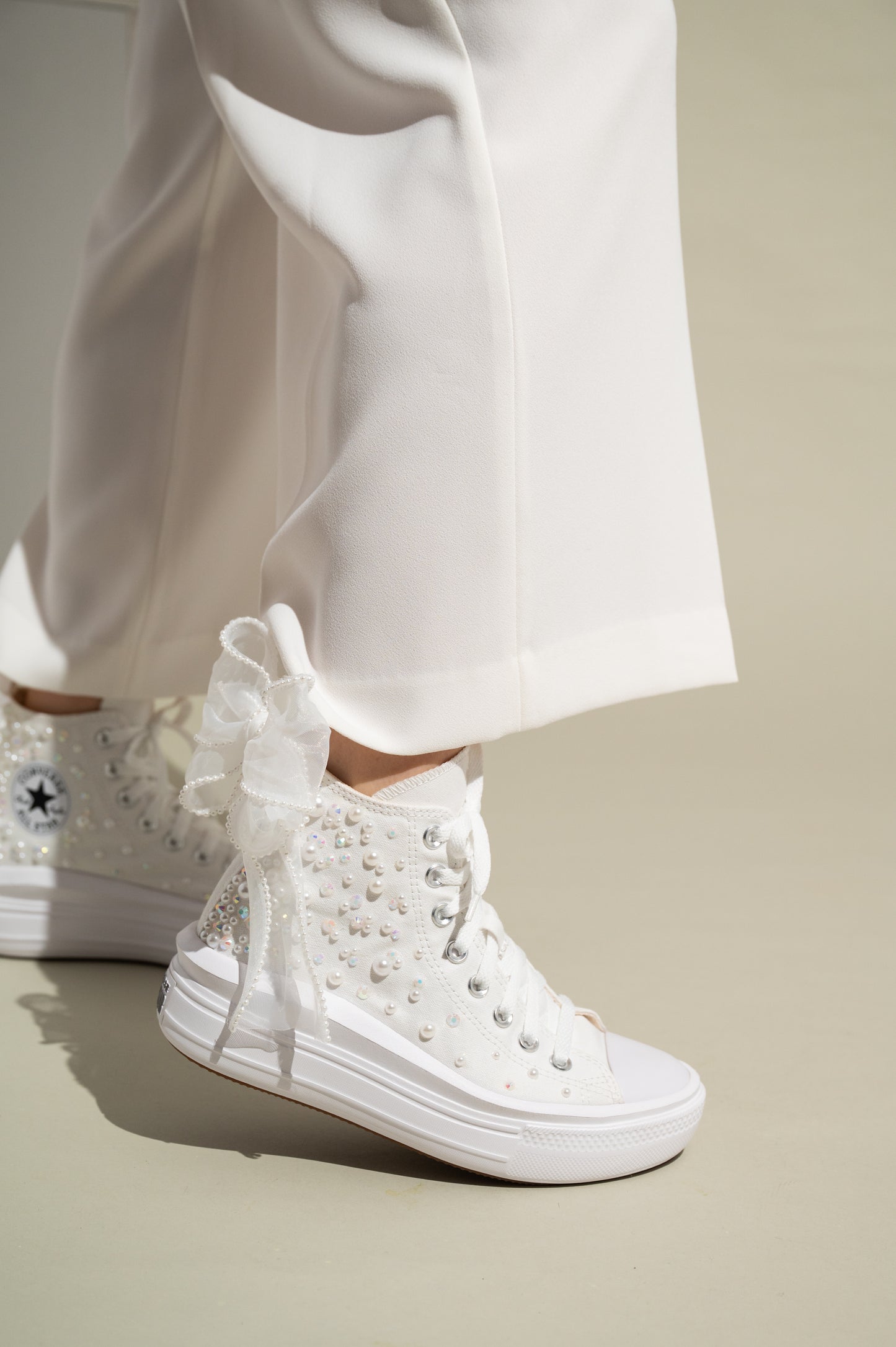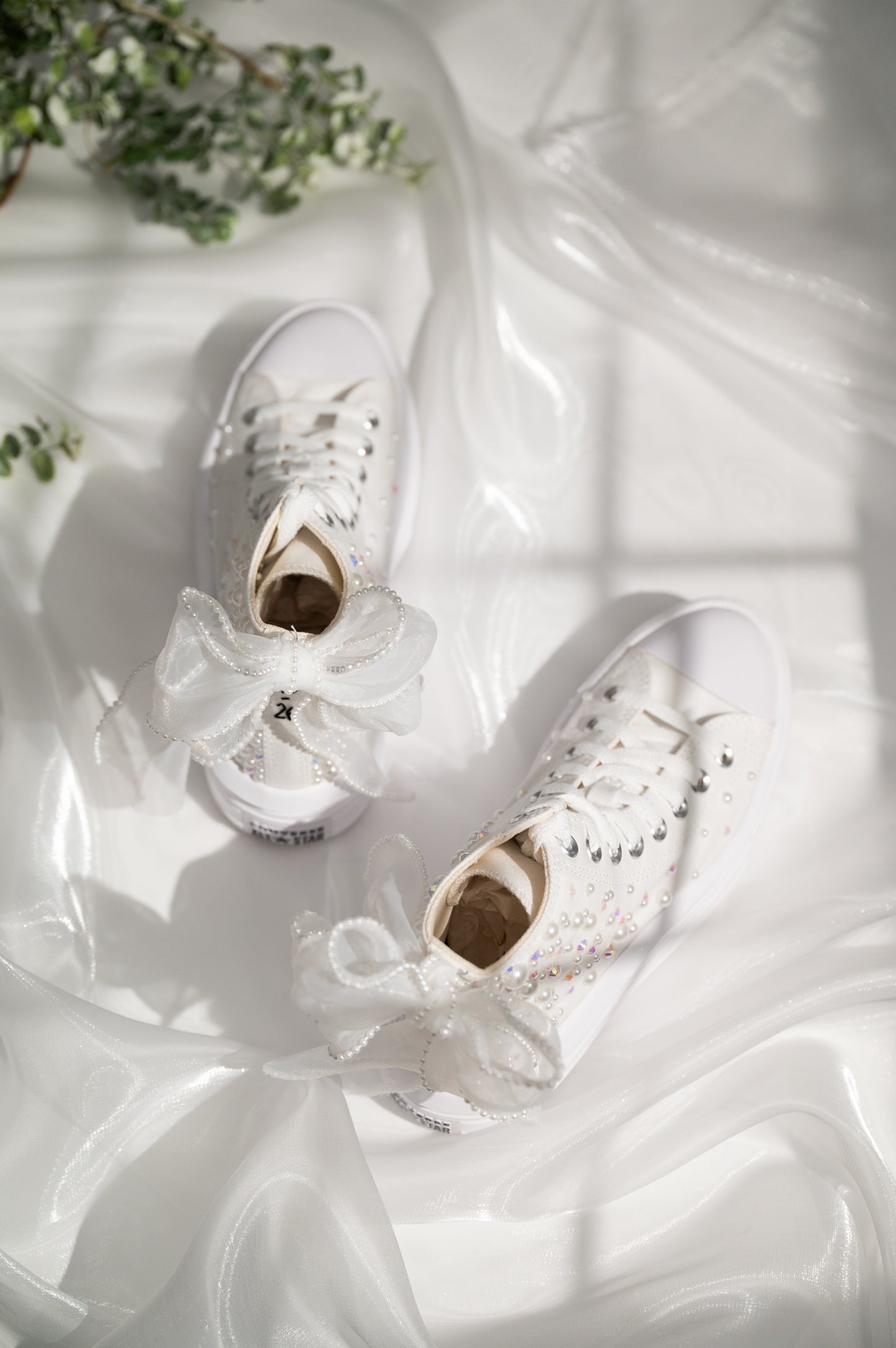 These white bridal Converse high tops transform an iconic silhouette into a romantic wedding statement. Adorned with pearls, crystals, and a delicate organza pearl bow, they blend timeless sneaker style with bridal elegance.